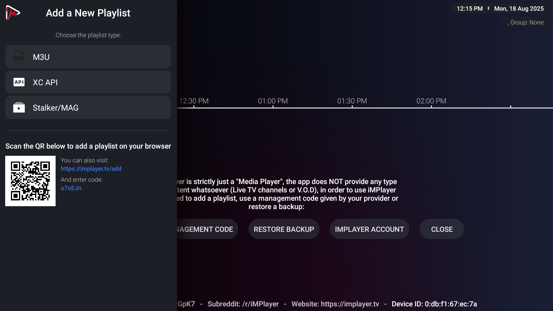 Option A (Easiest): Scan the QR code with your phone’s camera → it will open the iMPlayer setup site with your code pre-filled → tap Apply.