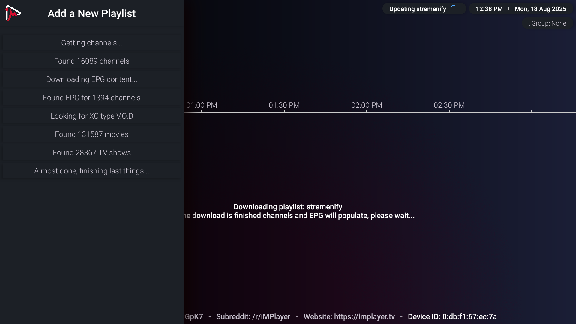 iMPlayer will sync your channels, guide, and VOD (this may take a few minutes).